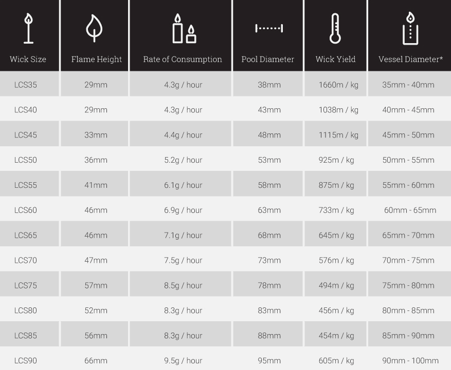 Le choix de la mèche se fait en fonction du diamètre du  contenant dans lequel vous souhaitez faire votre bougie. Utilisez des contenants qui supportent la chaleur.