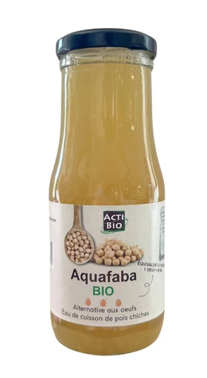 Aquafaba issu de l'agriculture biologique. Haute protéine (>20% VCT). Jus de cuisson de pois chiche bio. A utiliser en remplacement des œufs. Compatible avec le régime végétarien et végan. #vegan #mousseauchocolat #mayonnaise #aquafaba