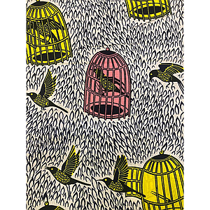 Tissus Wax - Cage oiseaux jaunes rose fond blanc