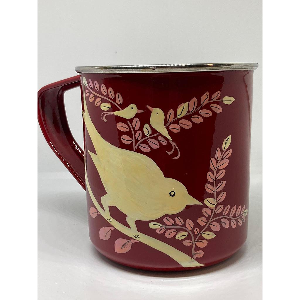 Mug en métal, décoration artisanale à la main, Inde. Fond rouge, oiseau crème. #cdvnoumea